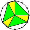 ここで、(問題2)ならば、下図のように半径で区切っていくことによって、頂角が30度の二等辺三角形(黄色の三角形)と、直角二等辺三角形(緑の三角形)に分けられ、知っている「基本の図形」になりました。